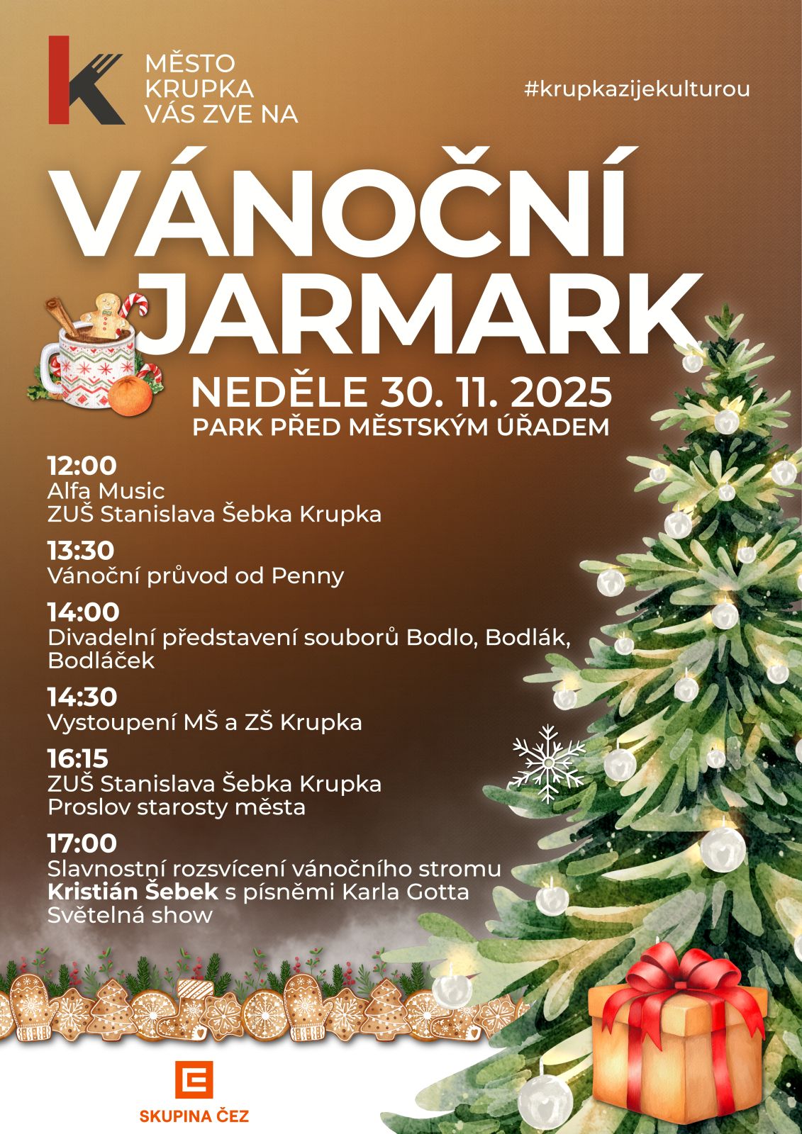 Město Krupka a Kulturní zařízení Města Krupka srdečně zvou na VÁNOČNÍ JARMARK, který se koná v neděli 30. listopadu v parčíku před městským úřadem od 12 hodin. Těšit se můžete na hudební vystoupení ZUŠ Stanislava Šebka Krupka v podání Alfa Music, divadelní představení, vystoupení dětí z krupských MŠ a ZŠ a v 17 hodin slavnostní rozsvícení vánočního stromu s písněmi Kristiána Šebka a světelnou show. Nebudou chybět ani stánky s dobrotami, vánočním zbožím a horkým svařákem.