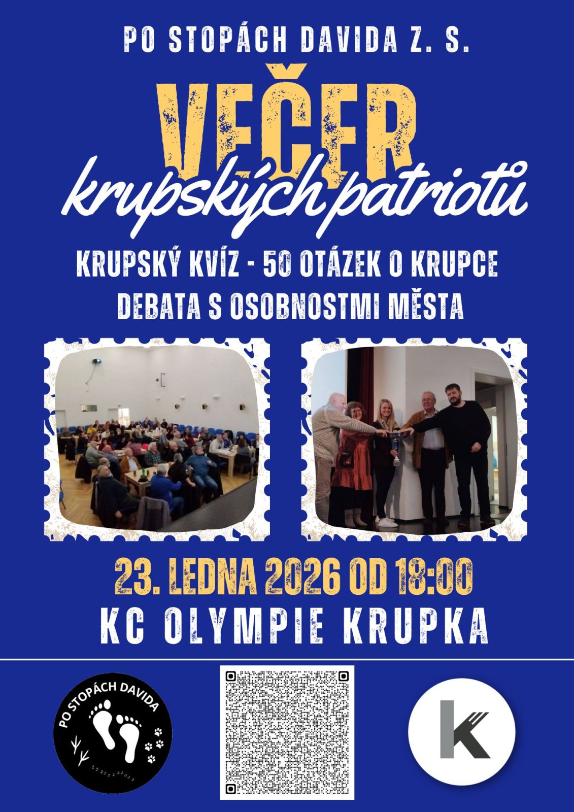 Spolek Po stopách Davida, z. s. vás srdečně zve na Večer krupských patriotů, který se uskuteční v pátek 23. ledna od 18:00. Akce se koná u příležitosti 3. výročí založení spolku.