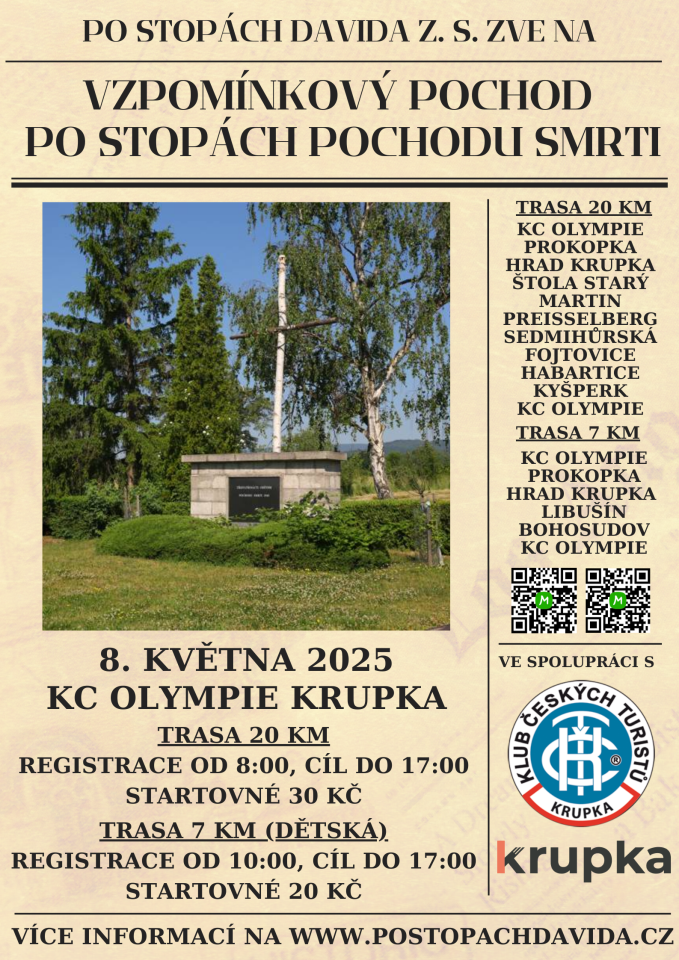 Spolek Po stopách Davida, ve spolupráci s KČT, odbor Krupka, vás srdečně zve na 1. oficiální ročník obnoveného vzpomínkového pochodu "Po stopách pochodu smrti", který se uskuteční 8. května 2025. Tento pochod vznikl v Krupce v roce 1970 jako dálkový pochod a zároveň vzpomínkový akt na 313 obětí transportu smrti v Bohosudově. Po více než třicetileté pauze byl loni úspěšně obnoven nultým ročníkem, kterého se zúčastnilo přes 60 účastníků. Tragické události, na které pochod odkazuje, se váží ke konci druhé světové války. Dne 24. dubna 1945 zastavil na nádraží v Bohosudově transport smrti s vězni různých národností, včetně Čechů, Poláků, Italů, Francouzů, Němců a Rusů. V důsledku vyčerpání, nemocí a nelidských podmínek zemřelo 313 vězňů, jejichž těla byla po válce uložena do hromadného hrobu u kostela sv. Prokopa, kde dnes stojí Památník 313 obětí transportu smrti. Další tragédie se odehrála ve Fojtovicích, kam 4. května 1945 dorazil pochod smrti z Fürstenau. Na tomto místě bylo nalezeno 59 obětí, které byly utlučeny tupými předměty. Jejich těla byla pohřbena do hromadného hrobu, nad kterým byl postaven památník připomínající tuto událost.